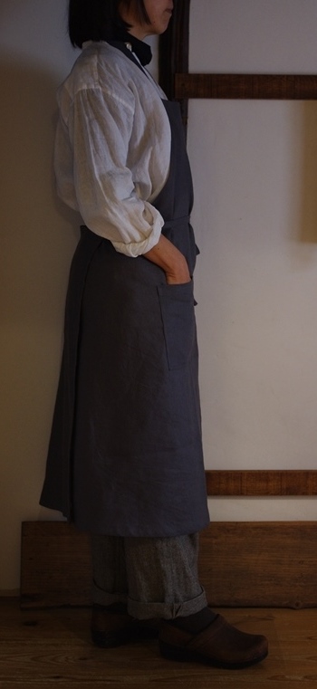 グレーのしっとりした質感のリネンで作ったAラインエプロンです。サイドからバックにあたる部分のパターンを工夫して、ウェストコードをぎゅっと絞っても足元が窮屈にならないよう、全体がAラインとなるパターンにしてありますので足さばきがとても楽。ギャルソンエプロンのように足元が狭くないのでとても歩きやすくなっています。
