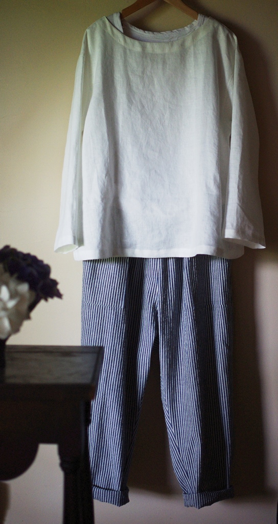 作るなら絶対これでと決めていた、細番手で少し透け感があって艶のある濃紺のリネンで作ったおかげかとても美人なブラウスに仕上がったように思います。