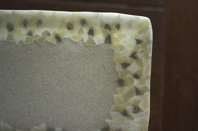 さてそんななか、友人でガラス作家のハマダミナコさんが遊びに来てくれて作品を置いていってくださいました。気泡がたくさん入った半透明のベースに白やベージュやカーキ色のモザイク模様が額のように縁取っている、とても美しい姿のプレートです。
